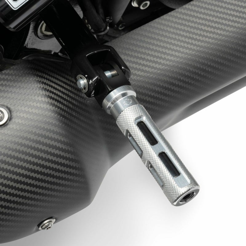 M8 ソフテイル、スポーツスターS、ナイトスター用 ライダーフットペグです。 <特長> ●九十九折りのワインディングロードを疾走するアグレッシブなライディングをイメージしたスイッチバック・デザイン。精緻な滑り止めナールと肉抜きが施されています ●鍛造アルミビレットより精緻な削り出し加工で製作された質感の高い製品 ●スポーティーなアルミシルバー。腐食や色褪せを防ぐクリアアルマイト仕上げ ●ライダーポジション用 ●左右ペア