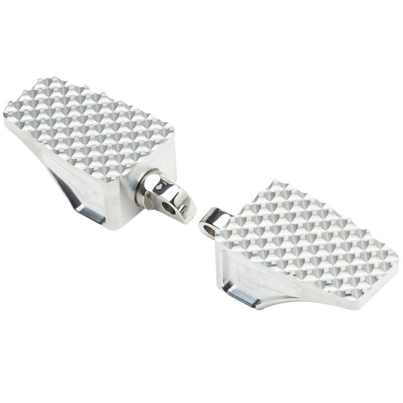 ビレットアルミニウム製 フットペグです。 M8ソフテイル ライダーポジション用です。 滑り止めを兼ねた、碁盤の目のように細かく区切られた模様がデザインアクセントです。 カラーはロウアルミ(アルミシルバー)。周囲のブラックパーツ、クロームパーツ共にマッチする渋い輝きです。 クレビスはステンレススチール製。 MXフットペグのような、しっかりとした踏みごたえとグリップを発揮してくれます。 左右ペア ※写真は他車種用のものです。(参考写真)