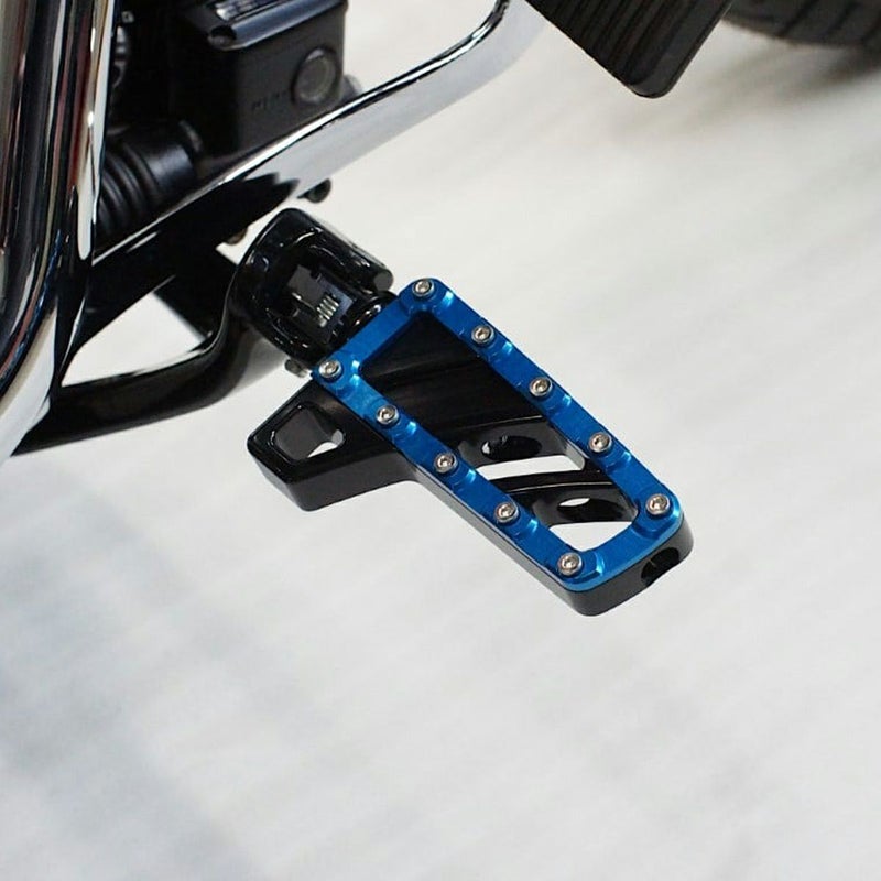 M8ソフテイル、スポーツスターS、ナイトスター用 ライダーフットペグです。 <特長> ●長さがM8ソフテイル標準装着ペグよりも30mm長く、足の自由度が高まります ●かかとを乗せる部分(長さ30mm)があり、安定感をもたらし長距離のツーリングも快適に過せます ●滑り止め兼ブーツによるキズ防止用のステンレスボルトがデザインアクセント ●フットペグの角度は好みに合わせて調整可能 ●アルミニウム削り出し加工品 ●ブラックカラー、腐食に強いアルマイト仕上げ。上面のトリムはブルーのアルマイト仕上げ ●左右ペア ※写真は他のカラーのものを含みます(参考写真)