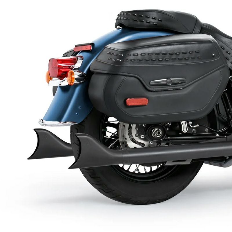 ソフテイルのマフラーは片側出しですが、このエキゾーストはバランスの良い左右出しスタイルに変えます。 ヘリテイジクラシックやデラックスに特に似合います。 マフラーエンドはシャークテール(フィッシュテール)(フィッシュテール)ですので、ノスタルジックな雰囲気を一層引き立てます。 エキゾーストパイプ外周を220度カバーする、16ゲージ厚のヘビーデューティーなフルカバー・ヒートシールドが付属します。 ヒートシールド外径は2.5インチです。 O2センサー用ポート付です。 音量を下げたい方は、別売消音バッフル(AC00173)を使用してください。 ※2021以降 ソフテイルは、O2キャンセラー(1081-0009)が別途必要です。 ※FLHC/S、FXLRST、FLSBに取り付けるには別途サドルバッグサポートアダプター(AC00249)が必要となります。