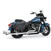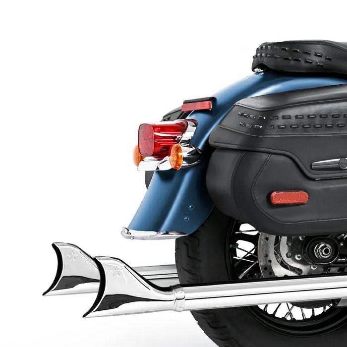 ソフテイルのマフラーは片側出しですが、このエキゾーストはバランスの良い左右出しスタイルに変えます。 ヘリテイジクラシックやデラックスに特に似合います。 マフラーエンドはシャークテール(フィッシュテール)(フィッシュテール)ですので、ノスタルジックな雰囲気を一層引き立てます。 エキゾーストパイプ外周を220度カバーする、16ゲージ厚のヘビーデューティーなフルカバー・ヒートシールドが付属します。 ヒートシールド外径は2.5インチです。 O2センサー用ポート付です。 音量を下げたい方は、別売消音バッフル(AC00173)を使用してください。 ※2021以降 ソフテイルは、O2キャンセラー(1081-0009)が別途必要です。 ※FLHC/S、FXLRST、FLSBに取り付けるには別途サドルバッグサポートアダプター(AC00249)が必要となります。