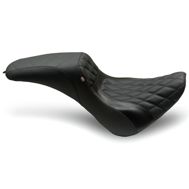 M8ソフテイル ストリートボブ、スタンダード用 ファストバックスタイル・ツーアップシートです。 ロープロファイルのライダー座面が足つき性を改善します。 バケット形状の座面で、低い位置に座ったライダーの腰をしっかりとサポートします。 リアセクションはトラディショナルなファストバック形状で、スリムなルックスとパッセンジャーにとって快適な座面アングルを両立しています。 シートフォームは適度な密度で最初から身体にしっくりと馴染み、長期間使用しても型崩れしません。 シートベースは頑丈なグラスファイバー製。 ライダー座面にはダブルダイアモンドステッチ入り。テールセクションは大柄なダイア調ステッチ入り。 座面のカーボン調パネルがモダンなアクセントになっています。 表皮は高品質な船舶部品グレードのビニールレザー。手縫いでしっかりと縫製されています。