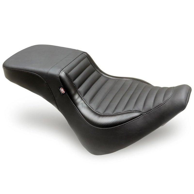 M8ソフテイル ブレイクアウト用 ツーアップシートです。 ライダーの足つき性を改善しつつ、タンデム時の快適な座り心地を求めるライダーに最適なシートです。 バケット形状の座面で、低い位置に座ったライダーの腰をしっかりとサポートします。 パッセンジャーシート側はスクエア形状でスポーティーなルックスとパッセンジャーの快適性を両立しています。 シートフォームは適度な密度で最初から身体にしっくりと馴染み、長期間使用しても型崩れしません。 シートベースは頑丈なグラスファイバー製。 ライダー座面にはタックアンドロールステッチ入り。更にサイドのカーボン調パネルがデザインアクセントになっています。 表皮は高品質な船舶部品グレードのビニールレザー。手縫いでしっかりと縫製されています。