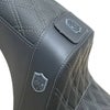 M8ソフテイル ローライダー/S/ST、スポーツグライド、エルディアブロ用 2UPシートです。 <特長> ●クラブスタイルで人気のSan Diego Customs(サンディエゴカスタムズ)と、品質と快適性でハーレーライダーからの評価の高いSaddlemen(サドルマン)のコラボレーションシート ●両サイドにはSDC(サンディエゴカスタムズ)のロゴエンブレム付 ●高く切り立ったライダーバックサポートが激しいライディング時にも確実にライダーの身体をサポートします ●ライダー座面はレーシーなカーボン調パネルを使用。バックサポートおよびパッセンジャー座面には滑りにくいグリッパー素材を使用しています ●ライダーシートにはゲル入りで、長時間の乗車も快適です ●ライダーバックレスト付ですので、長時間の乗車時にライダーの背中への負担を軽減します ●座面ステッチはラティス(格子柄)ステッチ入り。ステッチカラーはグレー