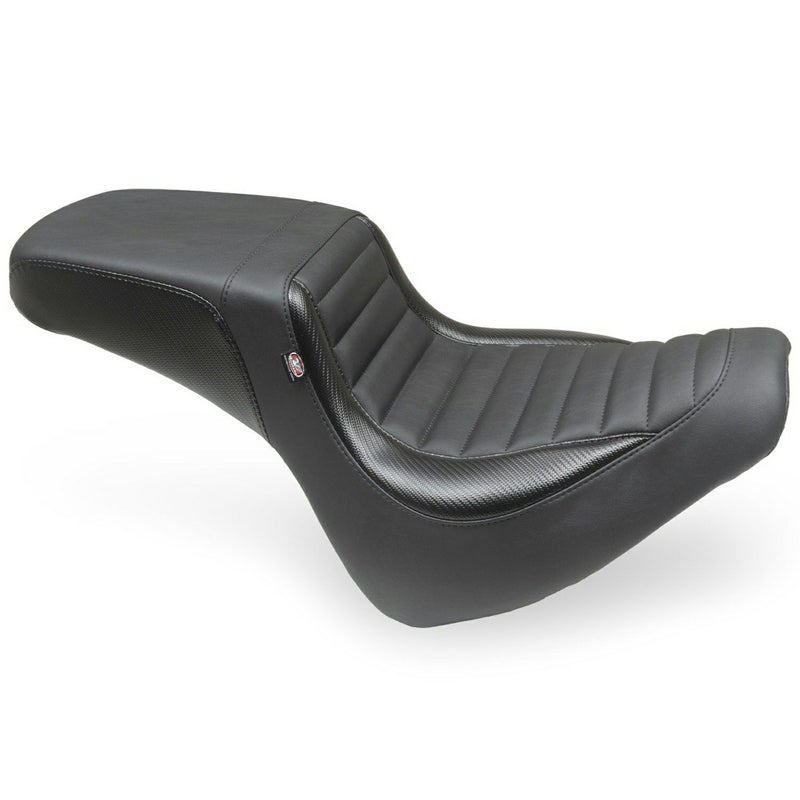 M8ソフテイル ファットボブ用 ツーアップシートです。 ライダーの足つき性を改善しつつ、タンデム時の快適な座り心地を求めるライダーに最適なシートです。 バケット形状の座面で、低い位置に座ったライダーの腰をしっかりとサポートします。 パッセンジャーシート側はスクエア形状でスポーティーなルックスとパッセンジャーの快適性を両立しています。 シートフォームは適度な密度で最初から身体にしっくりと馴染み、長期間使用しても型崩れしません。 シートベースは頑丈なグラスファイバー製。 ライダー座面にはタックアンドロールステッチ入り。更にサイドのカーボン調パネルがデザインアクセントになっています。 表皮は高品質な船舶部品グレードのビニールレザー。手縫いでしっかりと縫製されています。