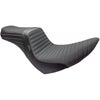 M8ソフテイル ローライダー/S/ST、スポーツグライド、エルディアブロ用 ツーアップシートです。 <特長> ●高く切り立ったバックサポートが特徴のキックフリップシートをベースに、パッセンジャーシート後端を跳ね上げた形状とすることでの快適性を高めています ●座面パネルは滑らないグリッパー素材。アグレッシブなライディングでもライダーを確実にホールドします。 ●座面はトラディショナルなプリーツ(タック&ロール)ステッチ入り ●シートフォームは一体成型の高密度フォーム ●シートベースはパウダーコート塗装仕上げ。カーペット素材でカバーし、車体に傷がつきにくい仕様です ※純正オプション・ミッドフレームエアデフレクター(29200105)との併用不可