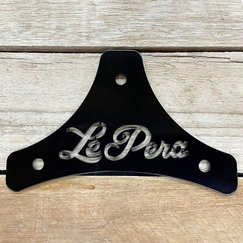 Le Pera(ラペラ)のDEAD END(デッドエンド)シリーズ・バックレストパッド用のバックプレートです。 このプレートを使用して、ツーリングおよびM8ソフテイルの純正デタッチャブル・アップライトシーシーバーに装着出来ます。 スチール製。レーザーカット加工品です。 センターにはLe Pera(ラペラ)のロゴ文字入り。 ブラックパウダーコートフィニッシュ。 1/4-20x1-1/4サイズの固定用ボルト3本およびナイロン製スペーサー3個が付属します。 ※装着写真は別デザイン(H-SB-LPCLASSIC)のものです。(参考写真)