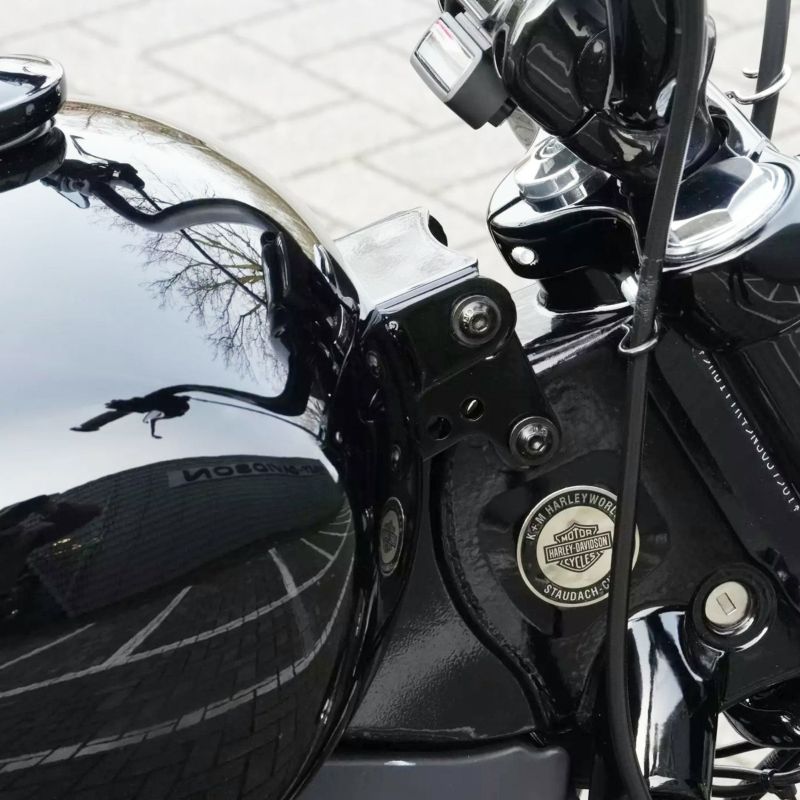 M8ソフテイル ストリートボブ、ブレイクアウト、スタンダード用 タンクリフトアップキットです。 スリムなタンクの前を持ち上げることで、チョッパースタイルにドレスアップ出来ます。 上面と両サイドを覆う形状で、フレームとタンクの隙間がカバーされ、すっきりとしたルックスに仕上がります。 頑丈なスチール製。 ブラックのパウダーコート塗装仕上げ。