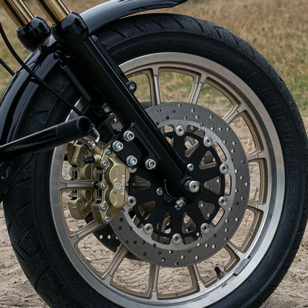 スポーツスター、ダイナ、ソフテイル、ツーリング用 フロント・フローティングブレーキローターです。 フルフローティング構造で、熱によるローター全体の変形を最小化し、ハードな使用でも常に安定したブレーキ性能を発揮します。 ディスクは炭素含有量の多い、420ステンレススチール製。熱処理により高強度、高硬度で耐久性に優れた素材です。 レーザーカットで製作されており、歪みの少ない仕上がり。更に精度の高い研磨加工でブレーキパッドとの当たりが均一になります。 キャリア部分はアルミビレットをCNCマシンによる切削加工で製作しており、軽量かつ頑丈です。耐腐食性の高いブラックカラーのアルマイト仕上げ。 リベットはステンレススチール製。アルミリベットよりもディスクの熱をキャリアへ伝えずらく、かつ頑丈です。スプリングワッシャー付きで、フローティングピンのがたつきを抑えます。 ※センターホールアダプター付で1984~1999の純正ホイールにも装着可能ですが、ノーマルブレーキキャリパーはフローティングピンと干渉のため使用不可。 ※センターハブマウント用。(スポークマウントディスク車不可) 単品販売