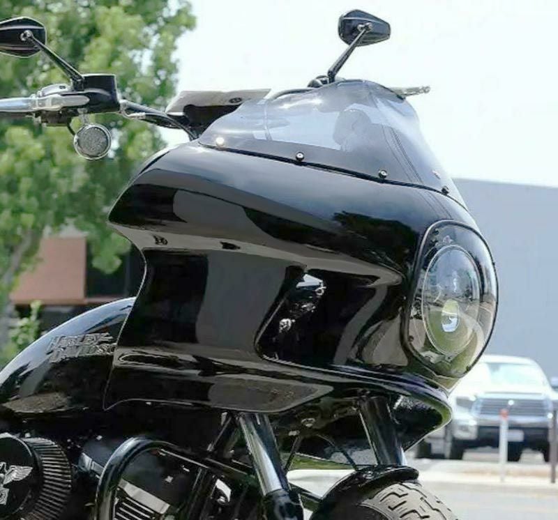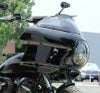 FXRTデザインのフェアリング。 横に張り出したデザイン、サイドのエアダクト、埋め込み式ヘッドライトカバーなど、かつてのFXRスポーツグライドのフェアリングを彷彿させる、現代でも新鮮なデザインです。 素材はファイバーグラス製でヘッドライトカバー固定用のナットが埋め込まれています。 ウィンドシールド、ヘッドライト(7インチ)固定金具を含みます。 両サイドのエアダクトからフェアリング内部に風を取り込み、整流効果によってフェアリングのブレを抑えます。 スクリーンは8インチ、スモークタイプです。 7インチヘッドライトが別途必要です。 ブラックパウダーコートのブラケットと、ハードウェアが付属します。 ※フェアリング本体は無塗装です。(写真は塗装参考例) ※ハンドルの形状によってはプルバック・ライザーなどが必要になる事があります。 ※新品ですが、取付けステーの塗装に若干の傷が入っている事があります。 ※装着写真は参考写真です。シールドや固定ボルトなど異なっています。(尖ったボルトが付属します。ボルトはお好きなボルトをお使い頂けます。) ※取り付けに多少のブラケット加工や調整が必要になることがあります。取り付けに自信のない方は経験のあるプロショップへご依頼ください。 ストリートボブ:FXBB、FXBBS ローライダー:FXLR ソフテイルスタンダード:FXST