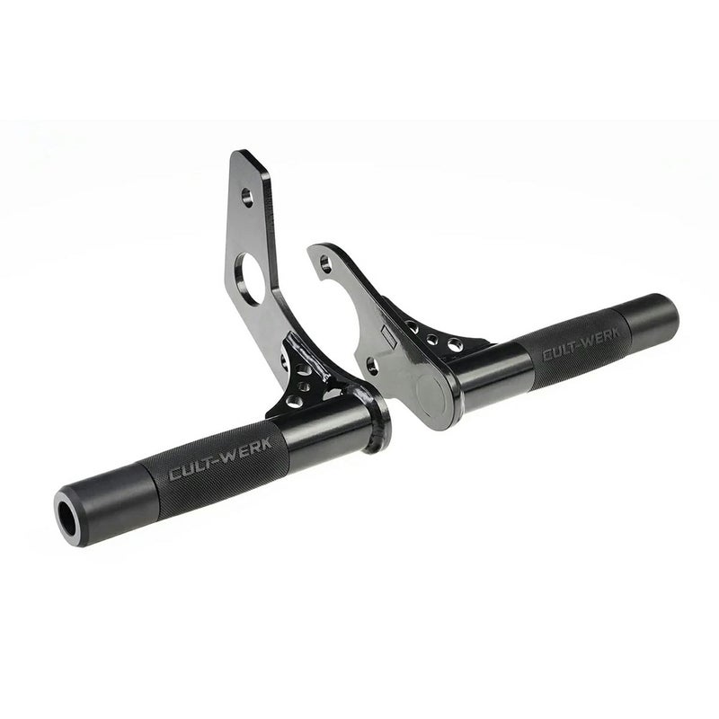 M8ソフテイル用 リアクラッシュバーです。 <特長> ●クラブスタイルのクラッシュバー。軽快さを損ねず、かつ転倒時には車体の損傷を軽減します ●スチール製。パーツは5軸CNCマシンで切削加工され、精緻な仕上がりです ●バーエンドには交換可能なプラスチックエンドキャップ付。転倒時に路面にひっかかりにくく、バーが傷つくのを防ぎます ●タンデムステップとして使用出来ます。Cult Werk(カルトヴェルク)ロゴ入り滑り止めステップラバー付です ●グロスブラックのパウダーコート塗装仕上げ ●左右セット ※仕様により取付け後、左右でクラッシュバーの位置がずれ込みます。 ※ノーマルのタンデムステップは併用不可 ※車両装着写真のアルミ製エンドキャップ(HD-BRO148)、およびゴールドスペーサー(HD-BRO146)は別売です。