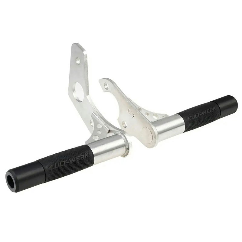 M8ソフテイル用 リアクラッシュバーです。 <特長> ●クラブスタイルのクラッシュバー。軽快さを損ねず、かつ転倒時には車体の損傷を軽減します ●ステンレススチール製。パーツは5軸CNCマシンで切削加工され、精緻な仕上がりです ●バーエンドには交換可能なプラスチックエンドキャップ付。転倒時に路面にひっかかりにくく、バーが傷つくのを防ぎます ●タンデムステップとして使用出来ます。Cult Werk(カルトヴェルク)ロゴ入り滑り止めステップラバー付です ●未塗装。ステンレスのシルバーがスポーティーな雰囲気です ●左右セット ※ノーマルのタンデムステップは併用不可 ※車両装着写真はグロスブラックのものです(参考写真) ※車両装着写真のアルミ製エンドキャップ(HD-BRO148)、およびゴールドスペーサー(HD-BRO146)は別売です。