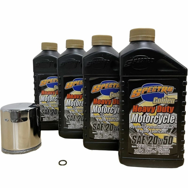 SPECTRO製 Heavy Duty Golden Semi-Synthetic(部分合成油)エンジンオイル 20W-50 通常のベースグレードオイルにハイグレードオイルを混ぜたコストパフォーマンスに優れたオイル。 SPECTRO製のエンジンオイルは添加剤の中でも奇跡の成分とも呼ばれる極圧減摩剤ZDDP(亜鉛/アルコール輝/硫黄/リン)をかなり多めに添加しています。 高温、高荷重、高回転時に金属同士の接触が起きる際に活性し、その本領を発揮します。 スペクトロオイルを使用している車輌と、そうではない車両のエンジンはバルブ廻りやシリンダー廻りの摩耗具合をみれば明らかに違いが分かります。 エンジン各部の摩耗が少なくなれば、必然的に摩耗抵抗も少なくなりエンジンの吹け上がりの良さにもつながり、摩耗熱も抑えられオーバーヒートも起こりづらくなります。 その他の成分として配合している成分 TCP:リンを含んだ添加剤でスパークプラグの汚れを少なくします。 カルシウム/マグネシウム:洗浄剤、分散剤として有効に働きます。カーボンの沈殿を防ぎ常にエンジン内壁をクリーンに保ちます。 上記成分を配合することで、ハーレー純正オイルとの比較においてもスペクトロオイルは1.4~2倍の非常に優れた性能を発揮しています。 ●Semi-Synthetic(部分合成油)(946ml) 4本 ●クロームオイルフィルター 1本 ●オイルドレンOリング 1個 上記の内容が一つになったオイルセットになります。