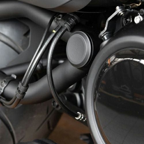 ハーレー ナイトスター RH975用 スイングアームアクスルカバーです。 スイングアーム周りをブラックアウトし、クールなルックスにドレスアップします。 アルミニウム製。CNCマシンによる削り出し加工品です。 マットブラックパウダーコート仕上げ。 左右ペア