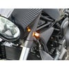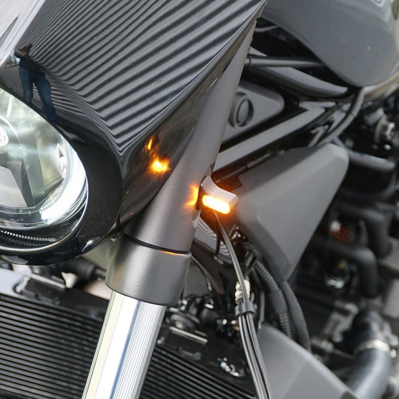 ナイトスター/S用 LEDフロントターンシグナルとアッパーフォークチューブカバーのキットです。 半艶消しブラックのLEDターンシグナル付フォークチューブカバーをノーマルフォークチューブに被せることでフロント周りをより精悍でアグレッシブなイメージにドレスアップします。 フォークチューブカバーはボルト止めではなく付属のOリングで固定するだけですので、カバーを外した際にも取り付け痕が残りずらいよう配慮されています。 ターンシグナルは横長シェイプ。すっきりとしたルックスと、他車からの視認性を兼ね備えています。 Eマーク付。 車種専用配線付き。レジスター内蔵で余計なレジスターも必要ありません。 ※配線接続作業は必要です。 取付けに必要なパーツが付属します。 左右セット