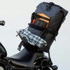 旅慣れたバイカーが作った実用的なツーリングバッグです。 荷物をコンパクトにまとめたい方むけにジャストサイズです。 本体はバリスティックグレードの、1680デニール・ポリエステルナイロン素材。 表面はPVCコーティング処理済みです。 メインコンパートメントはビール缶が60本入る容量です。 開口部はフレキシブルなロールアップ式です。 メインコンパートメント外側には小物の収納に便利なポーチ付きです。 ターポリン素材のフロントフラップに、ブランケットやジャケットを挟めます。フラップ前面はベルクロ素材のモールシステムとジッパー付ポケット付き。サイドには伸縮ストラップ付で荷物をしっかりと保持できます。フラップ背面にはメッシュポケット付きです。 ジッパーは耐久性、耐候性に優れたサーモプラスチック製です。