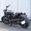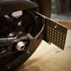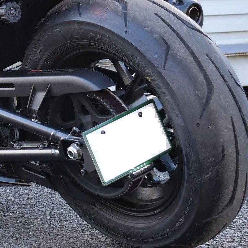 ハーレー スポーツスターS用 サイドナンバーブラケットです。 車検対応の横ナンバーですが、車体ぎりぎりに近づけでマウント出来るため、すっきりとしたルックスです。 付属のナンバー灯は白色光に光るLEDです。 ナンバーベースはアルミニウム製。ブラックのアルマイト仕上げ。 ブラケットは厚さ6mmの頑丈なスチール製。 焼き付け塗装済み。 ナンバーブラケット、カラー、ナンバー用プレート、ナンバー灯、ボルト、タイラップが付属します。