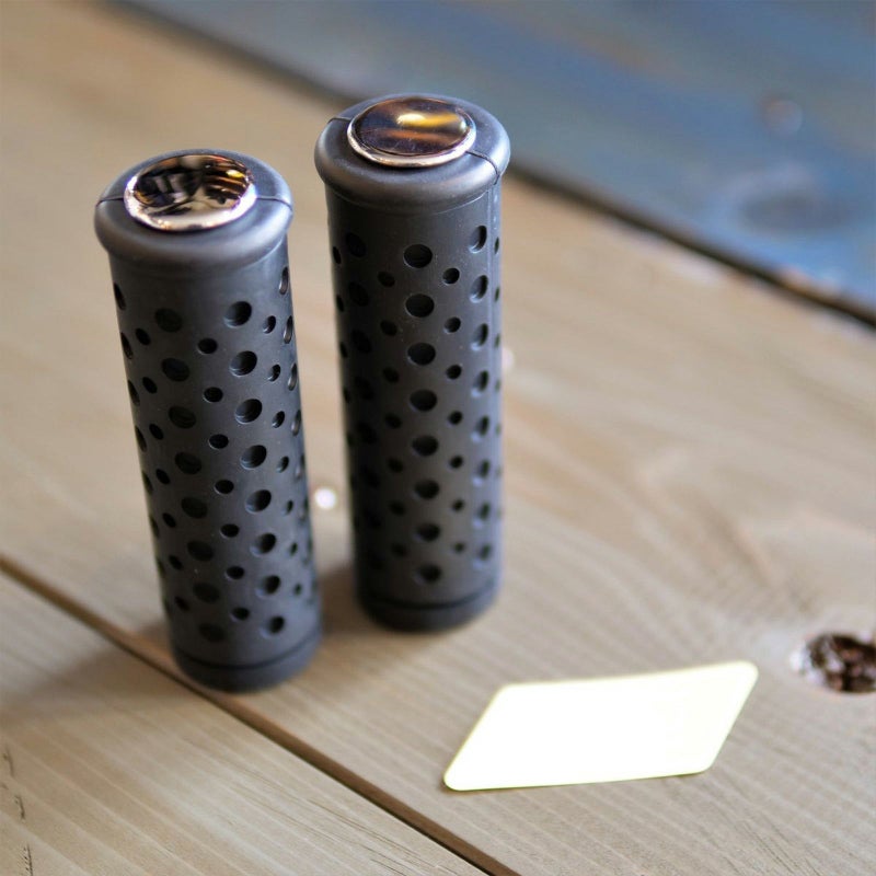 レトロスタイルのカスタムにマッチする、ハーレー用 内径1インチ・グリップラバーです。 <特長> ●耐熱性、耐候性に優れ、劣化しずらい高品質ラバー ●ユニークなパンチングパターン ●使い込むほどに艶が出てビンテージグリップのような味わいになります ●細身の握りやすい太さ ●ブラックのラバーにクロームのキャップ付き ※車両への取り付けにはスロットルチューブが必要です。