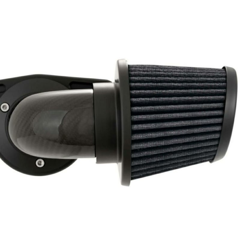 ハーレー ツインカム ツーリング、ソフテイルの、ケーブルスロットル車用ハイフローエアクリーナキットです。 エアインテークが直角に前方に突き出すホットロッドスタイルで、大量の空気を取り込める形状です。 ハイフローエアフィルターは円錐形のアグレッシブなスタイル。汚れたら洗浄して繰り返し使用出来ます。フィルターカバーにはV&H(バンスアンドハインズ)ロゴ入りです。 バックプレートはブリーザー一体型で、すっきりとしたルックスです。 ブリーザーボルトは12ポイントヘッドで、ハイパフォーマンスイメージのルックス。 バックプレート、フランジカバーはビレットアルミニウム製。CNCマシン削り出し加工のハイグレードな仕上がりです。 インテークチューブはウィーブドカーボンファイバー製。一目見てカーボンとわかる、スペシャルなルックスです。