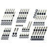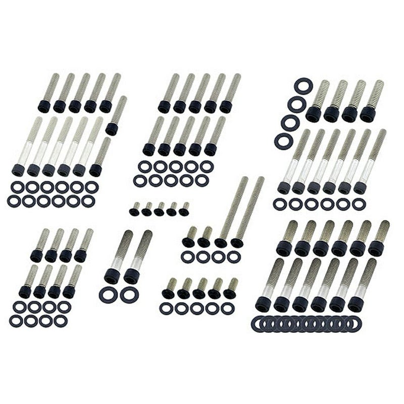 1999~2005 ダイナ、2000~2006 ソフテイル用 エンジンボルトセットです。 <特長> ●高強度ステンレススチール製。コストパフォーマンスに優れたエンジンボルトセット ●ヘッド部分はマットブラックのパウダーコート塗装仕上げ。装着時のドレスアップ効果も抜群です。ドイツの工場で塗装工程を行っており、腐食や傷に強い仕上がりです ●高強度ステンレスA2-70製。最小引張強度700N/mm2 ●プライマリーカバー、カムカバー、ダービーカバー、タイマーカバー、ロッカーカバー、リフターカバー、トランスミッションサイドカバー用ボルトのセット ※写真はイメージです