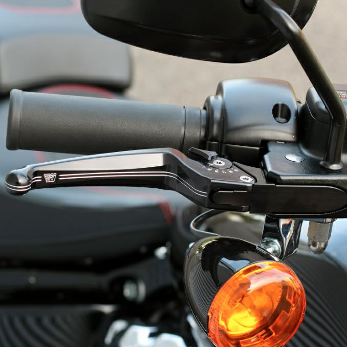 ハーレー用アジャスタブルクラッチレバーです。 レバーの遠さを6段階に調整可能です。 ビレットアルミニウム製。CNCマシンによる削り出し加工品です。 レバー本体はブラックアノダイズフィニッシュ。 レバー前面に2本ストライプとWUNDERKIND(ワンダーカインド)のロゴマークがエッチングされています。 ※写真はブレーキレバーです。(デザインイメージ写真) 油圧クラッチ用 単品販売
