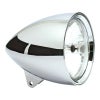 チョッパー等のカスタムに似合う、5-3/4インチ径ヘッドライトです。 ハウジングはアルミニウム製。前後方向に長いシェイプです。 リム部分はバイザーの無いシンプルなストレート。 レンズはEマーク付。 H4ハロゲンバルブ仕様。