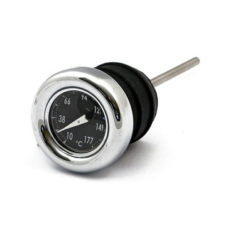 ハーレー スポーツスター、ソフテイル用 油温計付オイルディップスティックです。 ノーマルのオイルタンクキャップと交換するだけで、一目で油温を確認できる便利なキャップです。 表示は摂氏ですので、油温を直ちに理解できます。 アナログ表示のため、面倒な電池交換等が不要で、コストパフォーマンスの高い製品です。 表示温度摂氏10~177度。 文字盤は精悍なブラック。 ディップスティック長さは5.5cmです。