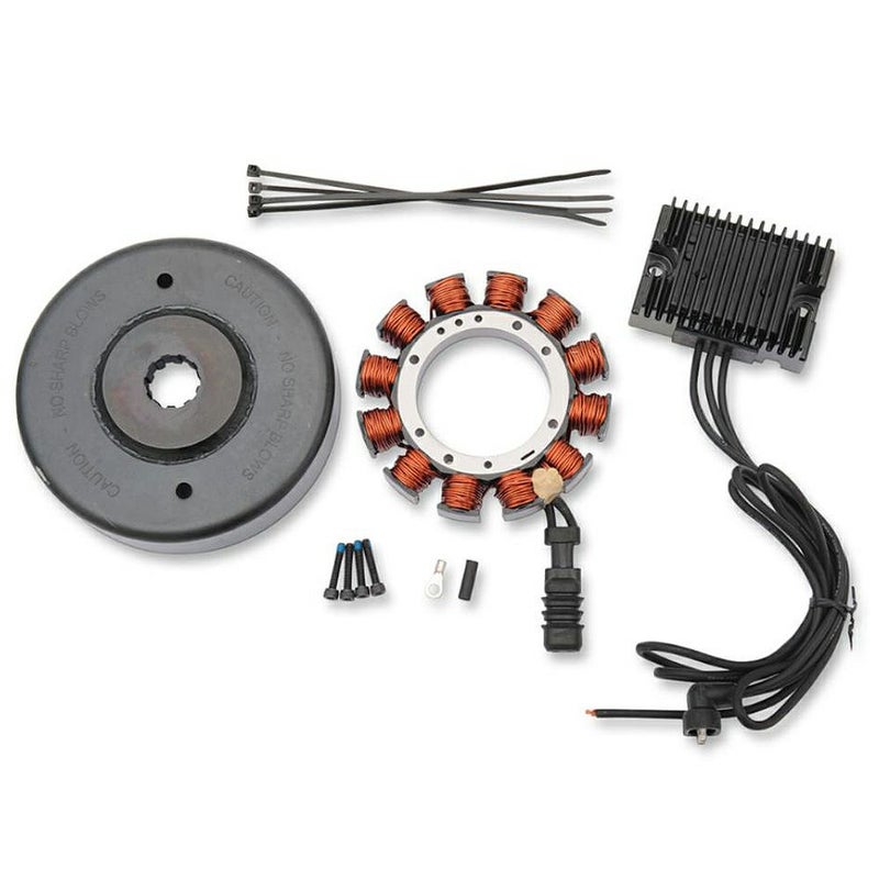 ハーレー エボ、ショベル ビッグツイン用 ヘビーデューティー ローター、ステーター、レギュレーターキットです。 マグネティックローターは純正品のセンター部分厚さ0.222インチ(約5.6mm)に対し、厚さ0.476インチ(約12.1mm)の強化仕様です。 ステーターコイルは精緻に巻かれおり、安定した発電性能を発揮します。 レギュレーターは32A仕様。カラーはブラック。 ※インジェクションモデル不可