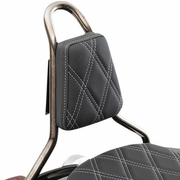 テーパードドシーシーバー用バックレストパッド。 耐久性に優れたハイグレードビニールで製作されています。 Drag Specialties製、クロームワークス製などのテーパード ラウンドシーシーバーに装着できます。 シルバーダブルダイアモンドステッチデザイン。 バックプレートはブラックパウダーコート処理されています。 ※シーシーバーやサイドプレートは含みません。