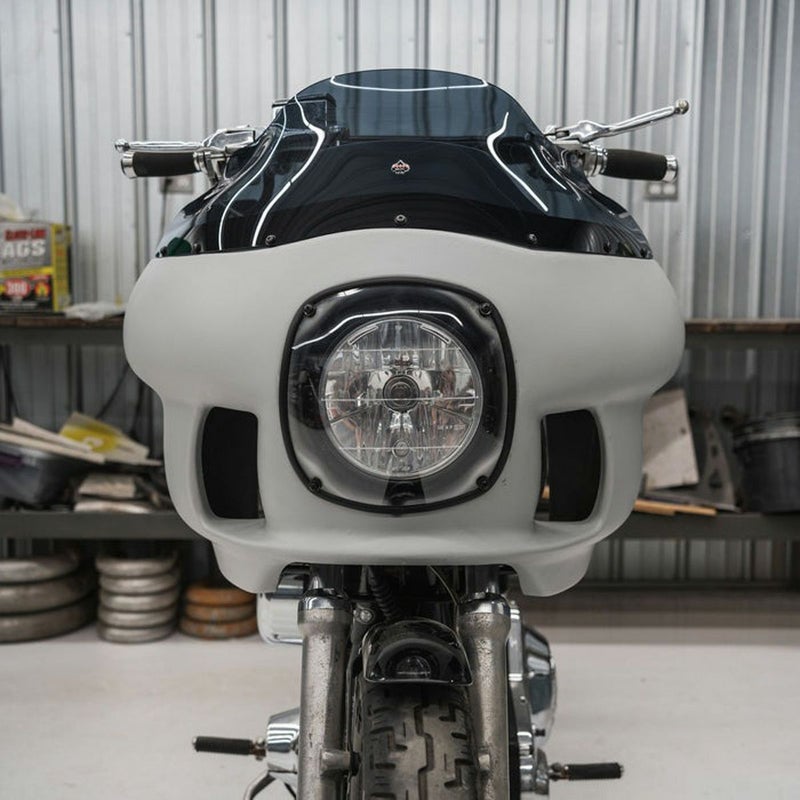 いまだに根強い人気を誇る、FXRP(FXRポリス)スタイルのフェアリングキットです。 <特長> ●迫力のフレームマウント大型フェアリング。愛車をハイスピード・クルーザーへグレードアップします ●頑丈なグラスファイバー製 ●未塗装。好みのカラーにペイントしてください ●7インチヘッドライト用マウント付属(ヘッドライトは付属しません) ●クリアレンズのヘッドライトカバー ●9インチ・フレアウィンドシールド付属(ダークスモークカラー) ●取付けに必要なハードウェア付属