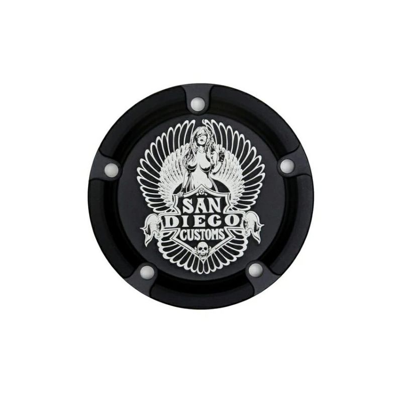 ハーレー ツインカムエンジン用のタイマーカバーです。 ビレットアルミニウム製。CNCマシン削り出し品。 ベースカラーはマットなステルスブラック。 ブラックのベースに、女神とSAN DIEGO CUSTOMSのロゴがエッチングされています。