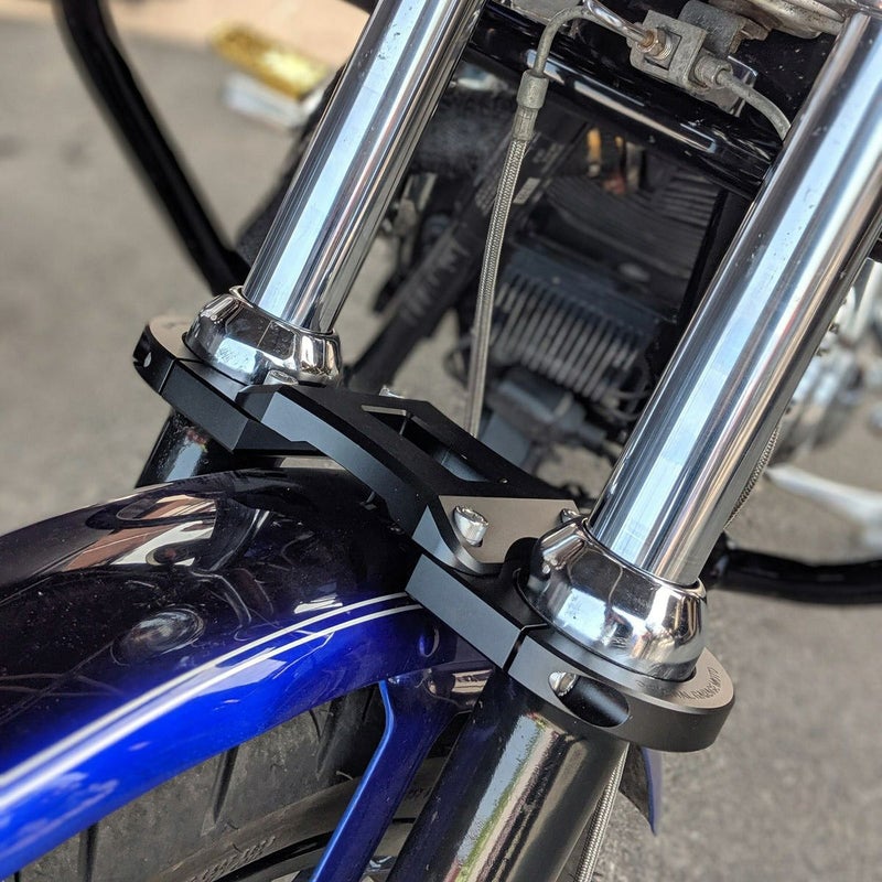 2005以前ダイナ、FXR、XLスポーツスターの39mmフォーク車用 フォークブレースです。 <特長> ●ハイスピード走行時のギャップや路面のうねりによるフォークのねじれ、ウォブルの発生を抑え、安定感がアップします ●39mm 正立フォーク、ナローグライド用(適合参照) ●5ピース構造で、フォークの着脱無しに取り付け可能です ●高強度 6061 T6ビレットアルミニウム製。CNCマシンによる削り出し加工で製作しています ●傷や腐食に強いハードアルマイト処理済み ●センターにはOriginal Garage Moto(オリジナルガレージモト)のイニシャルロゴが浮き彫りされています ●ステンレススチール製ハードウェアが付属します