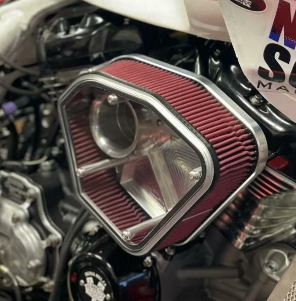 M8モデル用アロイアート製の異形エアクリーナー。 フィルターは前方にオフセットされ、足とのクリアランスを確保するために角度をつけて設計された特殊な形状です。 フィルター前面はクリアーのポリカーボネート製で中が見えるようになっています。 また、バックプレートはプラスチック製で軽量になっており、エアーの吸入口はファンネルのような形状で流入速度を高める形状になっています。 さらにブリーザーボルトの内径も通常のものより太く設計され、エアーが大量に取り込める構造になっています。 セッティング次第でかなりのハイパフォーマンスが見込める設計のエアクリーナーです。 フィルターは厚さが1.8インチ(約4.6cm)と2.8インチ(約7cm)の設定があります。