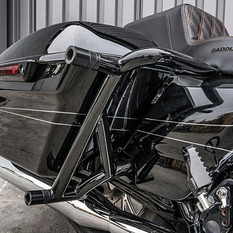2009以降 ツーリング用 前後クラッシュバーセットです。 プロのスタントライダーから一般のツーリングライダーまで、転倒時にバイクの損傷を軽減してくれる頼もしいアイテムです。 マウントプレートは頑丈な7ゲージ(約3.7mm)厚のマイルドスチール。TIG溶接でしっかりと組み立ててあります。 ブラックのパウダーコート塗装仕上げ。 クラッシュバー先端には摩擦に強いデルリン樹脂製スライダー付きです。 リアもフロント同様、サドルバッグガードを兼ねた頑丈なクラッシュバーがセットになっています。 ※ロワーフェアリング装着車不可 ※ロードグライドのエンジンガードマウント式フェアリングサポート不可 ※CVOモデルのチンスポイラー、その他チンスポイラー不可(通常のオイルクーラーカバーへ交換が必要)