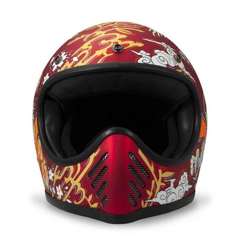 高度な安全技術で作成された高品質で軽量なフルフェイスヘルメット。 左右非対称のデザインが施されており、シェルの左側には龍、右側には虎が描かれていて、見る方向によって印象が変わる二面性を持ったデザインとなっております。 シェルはカーボン製で、インナーには本革とシャリマーを使用し、優れた、柔らかさ、快適さに加え、汗の吸収性にも優れた生地で作られています。 また、トリム部分にも本革を使用しています。 3点止めのバイザー装着可能。 ゴーグルを着用する場合でも十分なスペースがあります。 ※欧米人向けの形状なので、普段より1~2サイズ大きいサイズを推奨します。 ※装飾品