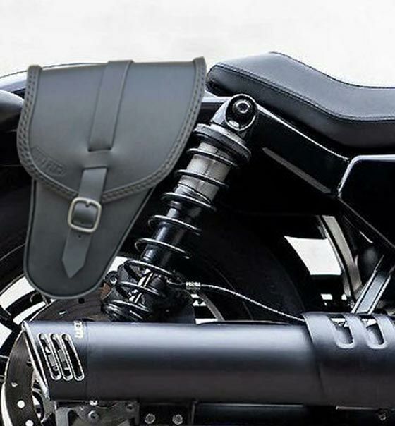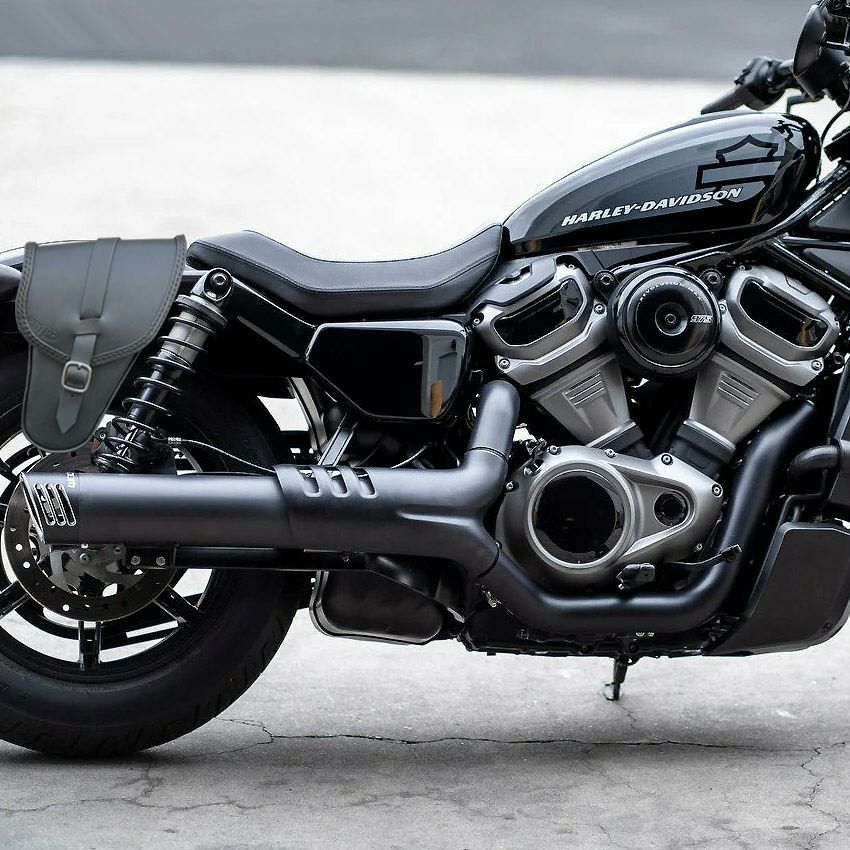 ナイトスター RH975用 小型レザーサドルバッグです。 ホルスターシェイプのサドルバッグ。リアスペンション後方のスペースに装着します。 伝統的なスポーツスターのデザインを承継するナイトスターにマッチし、バイクのスタイルに溶け込みます。小物の収納に便利です。 革は厚さ4mmの丈夫なレザーを使用、熟練の職人によるベジタブルタンニンなめしの革は使い込むほどに味わい深くなります。 ブラックのレザーにブラックのステッチカラーの、飽きが来ないルックスです。 クラシックスタイルのバックルストラップ付。 ノーマルリアウィンカーは移設の必要ありません。 背面にはスチールプレートを内蔵していますので、荷物が重くなってもバッグをしっかりとホールドします。 取付けに必要なハードウェアが付属します。 右用 ※車両装着写真は参考写真です。