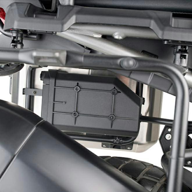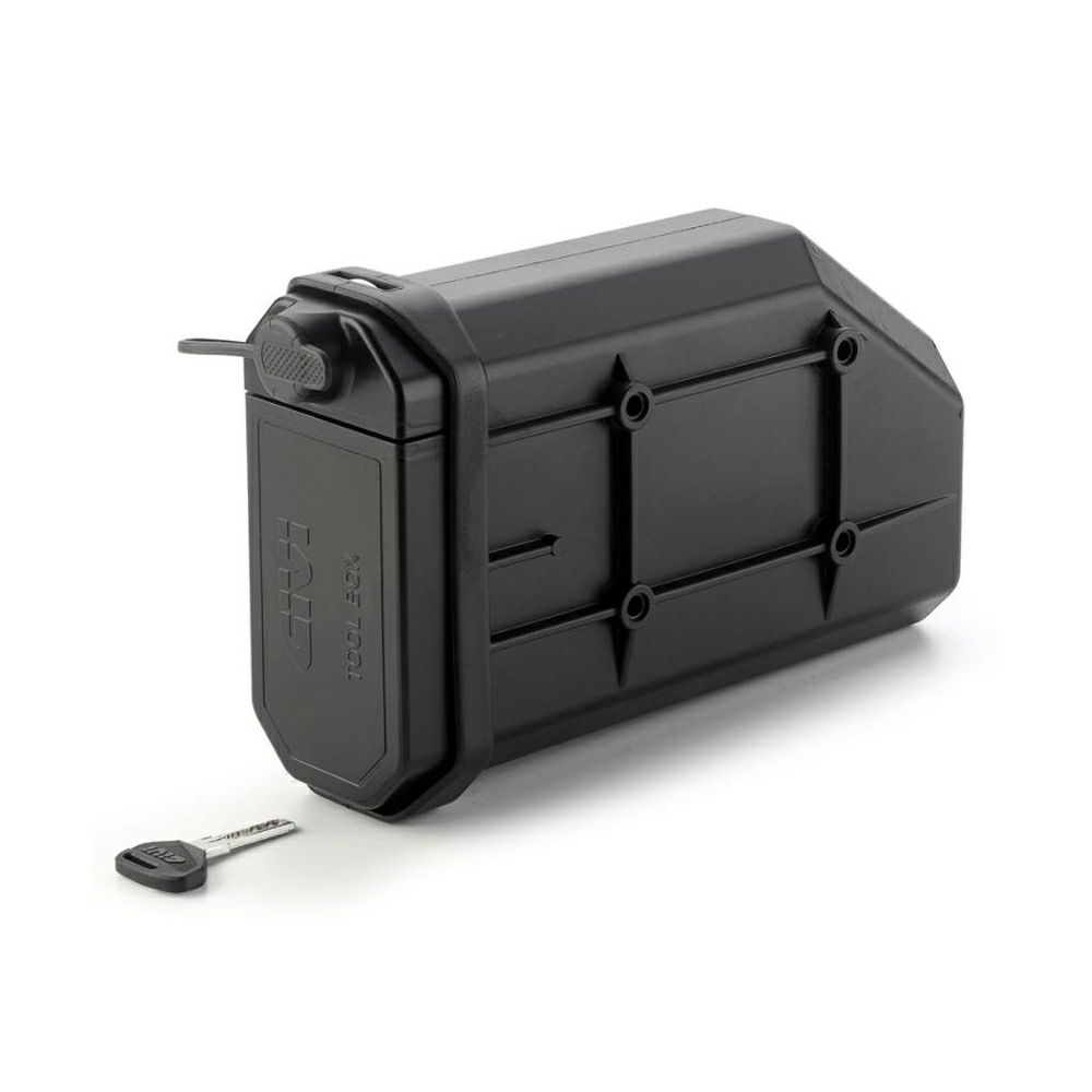 車載工具を収納できる、キー付ツールボックスです。 防水仕様。 キーシリンダーダストカバー付。 蓋にキーロック付きですので、バイクに装着すれば、中身の高価なツールの盗難防止になります。 工具の整理に便利な、脱着できる上下間仕切り付きです。 別売の車種専用フィッティングキットを使用し、GIVI製サイドバッグマウントの、マフラーと反対側に装着します。 ※フィッティングキット、サイドバッグマウントは別売です。