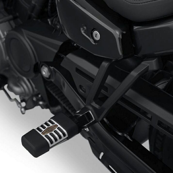 ハーレー ナイトスター(RH975)用 パッセンジャーフットペグマウントとフットペグのセットです。 マウントはリアフレームにボルトオンで装着出来、バイクに違和感なく溶け込みます。 ブラックの左右パッセンジャーフットペグも付属します。 ※車両装着写真のペグは付属するものと異なります。 ※部品単体写真のペグが付属します。 その他取り付けに必要なハードウエアが付属します。