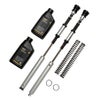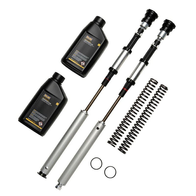 M8ソフテイル ローライダーS/ST、スポーツグライド、ファットボブ、エルディアブロ用 フロントサスペンションキットです。 左右カートリッジ式ダンパーおよびフォークスプリング、フォークオイルのセットです。 ダンパーは左側が圧側、右側が伸側を各々担当します。 プリロードおよび減衰力調整はフォークトップで行うことが出来、きめ細かいセッティングが可能です。 オーリンズの高精度なカートリッジは常にスムースな作動を実現します。 ハードなライディングでも安定したハンドリングとロードホールディングを実現します。 倒立フォーク車用