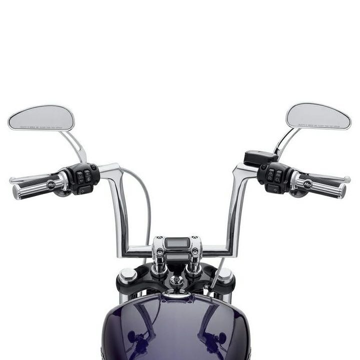 ハーレー M8ソフテイル 1.25インチ径ハンドルクランプ用のロープロファイルミニエイプハンドルバーです。 ロードキングスペシャルにも装着可。 ロープロファイルのZシェイプはクラシックテイストのクラブスタイルかつ、最新のウエストコーストスタイルです。 カラーはゴージャスなクローム。 ハンドル径は1.25インチ。ライザークランプ部分も1.25インチ径。ハンドコントロール部は1インチ径です。 角の部分は鋳造パーツで、配線が引っかかりずらい滑らかな内部構造です。 ※電子制御スロットル車用 ※配線中通し用の穴が開いています。
