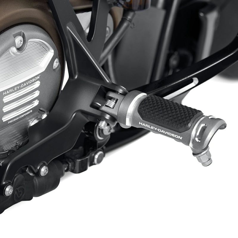 ハーレー スポーツスターS用 ライダーフットペグです。 鍛造アルミニウム製。 グラファイトカラーのベースに、精緻にマシンカットされた部分のアルミシルバーのコントラストがアグレッシブでハイパフォーマンスなイメージを演出します。 滑り止めナールパターンのラバーもデザインアクセントになっています。 左右ペア