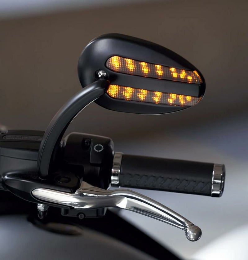 機能性とスタイリッシュさを両立させたデザインになっているランニングライト&ターンシグナル付きミラーです。 車両のデザインに沿うように設計された伝統的なティアドロップタイプ形状のミラーは、現代的な機能を盛り込まれており、様々な方向性に進められたカスタム車両との相性も抜群です。 - スモークレンズ仕様のLEDはアンバー色となっており、イグニッションオン時にはランニングライトとして点灯します。 - ターンシグナルの操作に連動して点滅します。 - ハザードランプを点灯した際は、両ミラーともに点滅します。 - 配線はミラーのハウジングとステー内に収まっているのでスマートに取り回しが出来ます。 また、純正のハーネスに簡単に接続する事が出来ます。 ※ ウィンカー及びランニングライトは本国仕様の点灯方式となりますので日本の車検規格に適合はしていません。 ※ 画像2枚目は参考画像になります。 左右ペア。