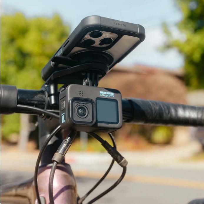 ROKFORMスマホホルダーとGo Proを上下同時にバイクや自転車のハンドル等に固定するためのマウントです。 4種類のスペーサーが付属し、22㎜~35mm径のハンドルなどに対応します。 KIJIMAのバーマウントなどにも適合します。 ROKFORMはツイストロックでカチッとスマホホルダーを固定するので落下しにくい構造ですが、落下防止用のストラップが付属します。 T20 Torxレンチが付属するので、そのまま簡単に取付けできます。