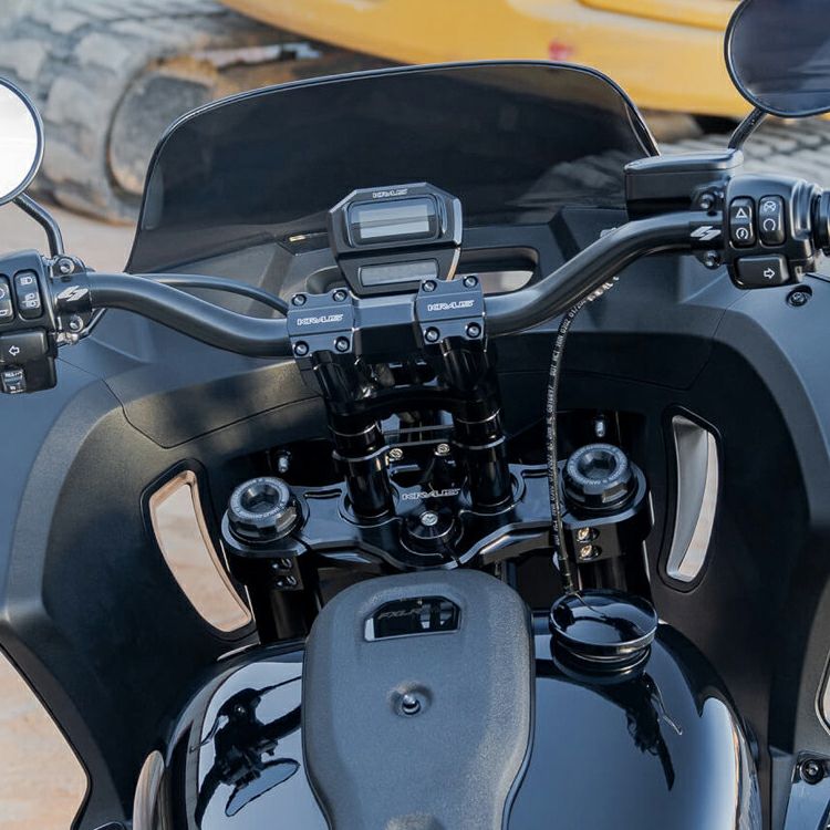 ローライダーST、ストリートボブ、スタンダード、スポーツグライド用 10インチライザーキットです。 ライザー、モトハンドルバー、ゲージベゼルがセットになっており、よりアグレッシブなアップライトポジションになります。 また、ノーマルライザーよりもソリッドな剛性感の高い操作感になります。 ライザー、ゲージベゼルはビレットアルミニウム製。CNCマシンによる精緻な削り出し加工品です。 ハンドルバーはモトスタイルに欠かせない頑丈なテーパータイプ。クランプ径は1-1/8インチです。 キット内容: 10インチアイソレーテッドライザー Fly Motoスタイル1-1/8インチ径ハンドルバー M8ソフテイル用デジタルメーターベゼル(3インチエクステンション付) ※車種により別途ブレーキライン、クラッチケーブル、配線の延長が必要となります。 ※車両装着写真は8インチライザーのものです。(参考写真)