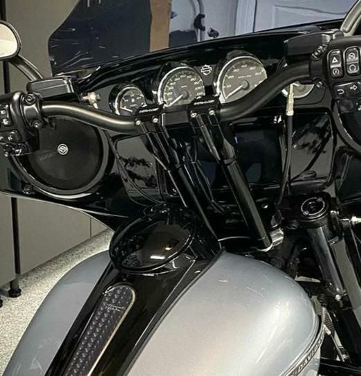 ハーレー ツーリング・バットウィングフェアリング装着車用、プルバックプレート、ストレートライザーとモトスタイルハンドルバー等のキットです。 付属のプルバックプレートで、ライザー取り付け位置が2.5インチ(約6cm)手前に来るため、ナビゲーションやステレオなどに干渉することなく、ストレートライザーを装着出来ます。 ※イグニッションスイッチは移設が必要です。 ※ハンドルロックは使用出来なくなります。 ライザーは8インチのストレートライザー(Isolated Riser)。 ライザーボルトが付属します。 ハンドルバーはFLYの1-1/8インチ径、モトハンドルバー。 トップクランプおよびハードウェアも付属します。 アッパートリプル~モトハンドルバートップまでの高さは12.5インチ(約32cm)になります。 更にKRAUSのロゴマーク入りハンドコントロールパーチ・ハーフクランプ(左右)も付属します。