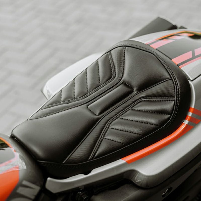 スポーツスターS用 フロントシートです。 プレデターの鎧をイメージしたステッチパターン。 パネルにはカーボンファイバー柄のアクセントトリムを配してあります。 シートフォームの厚さはノーマルシートと同じですが、シートパン形状を工夫し、より深くシートカウルに沈み込んで設置されるため、外観はノーマルよりもスリムなルックスになります。 シートパンは頑丈なグラスファイバー。 しっかりとしたポリウレタン製シートフォームとの相乗効果で快適な座り心地です。 別売の同デザインパッセンジャーシート(SPS12)と組み合わせることも可能です。