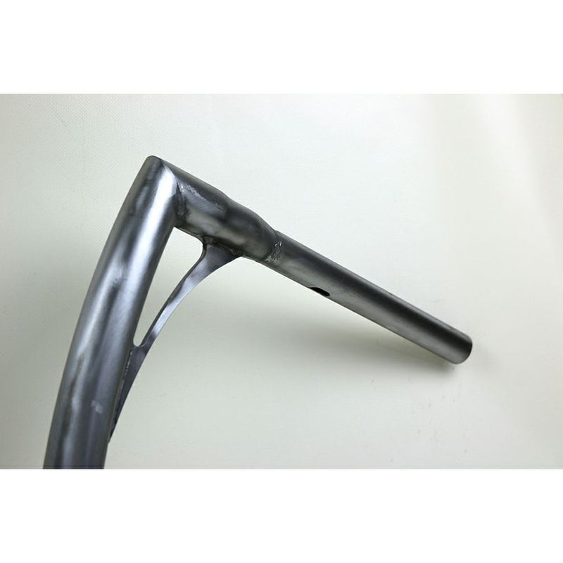 ドイツのカスタムビルダー、フレッドコドリンのデザインによるハーレー用エイプハンドルバーです。 ロードキングスペシャルに合わせたサイズです。 溶接された補強ブレイスがデザインアクセントです。 1.4インチ(35mm)径。迫力あるルックスです。 ハンドコントロール部は1インチ径。 クランプ部は1.25インチ径です。 パイプは3mmの肉厚があり、重さがありますので、振動が伝わりにくくなっています。 ヨーロッパの安全認証機関TUV(テュフ)の認証取得品ですので、十分な強度を確保した安全性の高い製品です。 塗装やコーティングをしていない、ロウスチールです。 そのまま装着してワイルドな味わいや経年変化を楽しむことも、また好みのカラーに仕上げることも可能です。 電子制御スロットル車用
