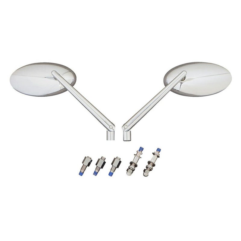 シンプルなオーバル型をしたカスタムミラーです。 ステムの根元で角度調整が出来ますので、 車両に合わせてベストなポジションに調整する事が出来ます。 ※汎用ミラーですので、用途に応じて付属のアダプタを使い分けて下さい。 左右セット