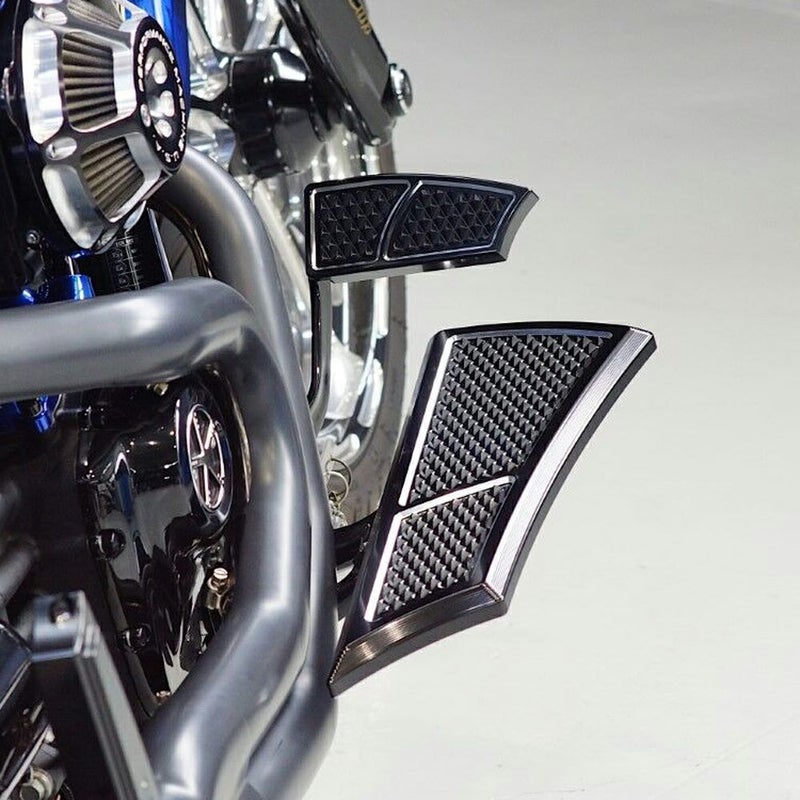 M8ソフテイル ファットボーイ、スリム、デラックス、ヘリテイジクラシック用 フロアボードです。 アルミ削り出しの高級感のある仕上がりです。 ブラックカラーのアルマイト仕上げ。 ノーマル車両にもカスタム車両にも似合うデザインで、フット周りのドレスアップに最適です。 サイドスタンドの出しやすさにも配慮した、細やかな気配りの行き届いた設計です。 カスタムファクトリー ノイズ(NOY'S)の同デザインブレーキペダルやシフトペグ等と組み合わせて統一感を楽しむことも出来ます。 左右セット
