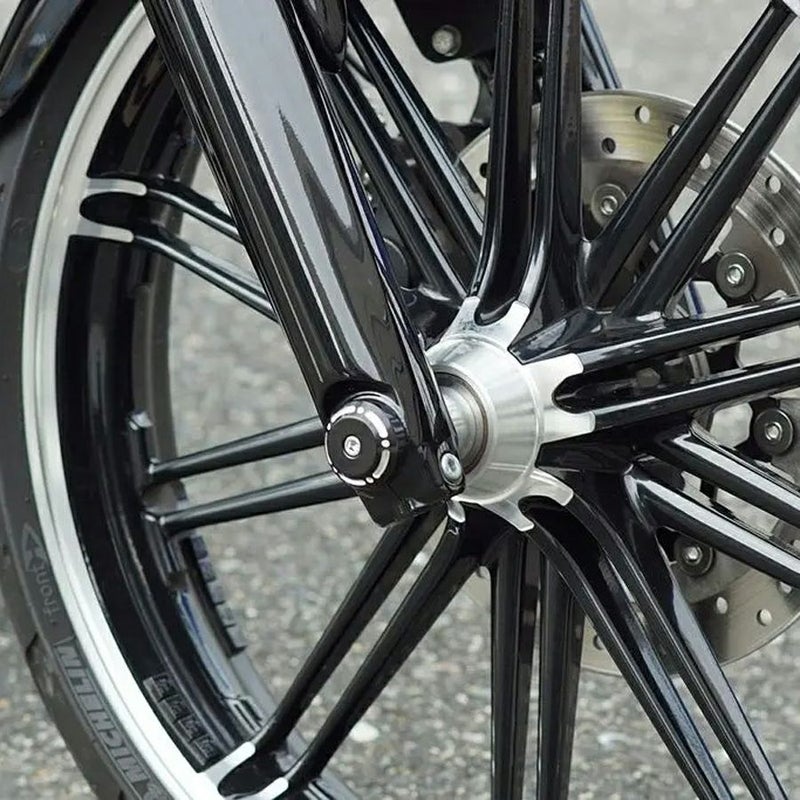 M8ソフテイル ブレイクアウト用 フロントアクスルカバーです。 アルミニウム製の削り出し加工品で、質感の高い仕上がりです。 ブラックカラーのアルマイト仕上げ。シルバーのコントラストカラーがデザインアクセントになっています。 フロントアクスルシャフトに付属の専用シャフトを挿入し、両端にカバーを取り付けます。 取付け用ボルトも付属します。 左右セット